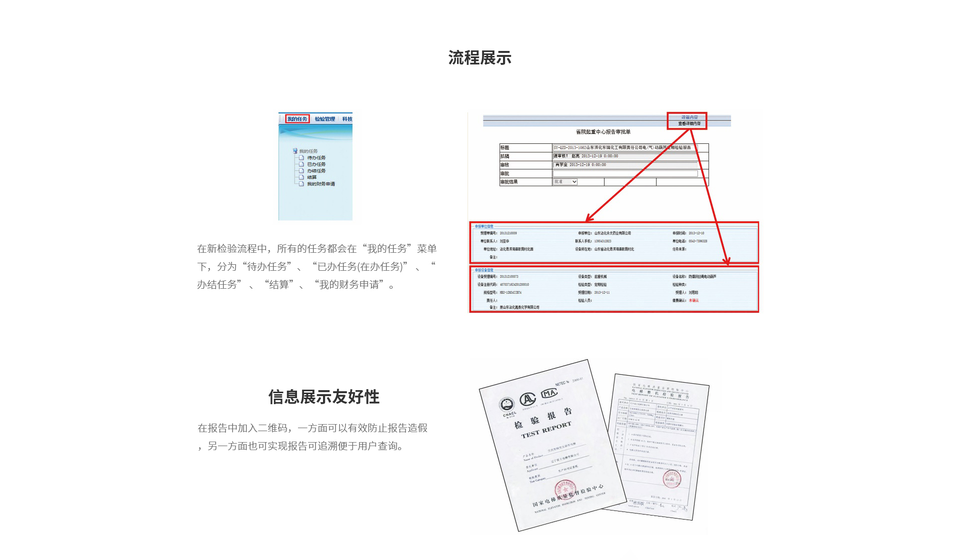 把整个业务流程整合到一个统一的流程 中,从报检、受理、制订方案到生成报告完全在一个流程中。 这样就可以有效的对每一台设备进行有效的监管和控制,可以查询到每一台设备所在的环节、办理人、办理意见、办理时间。