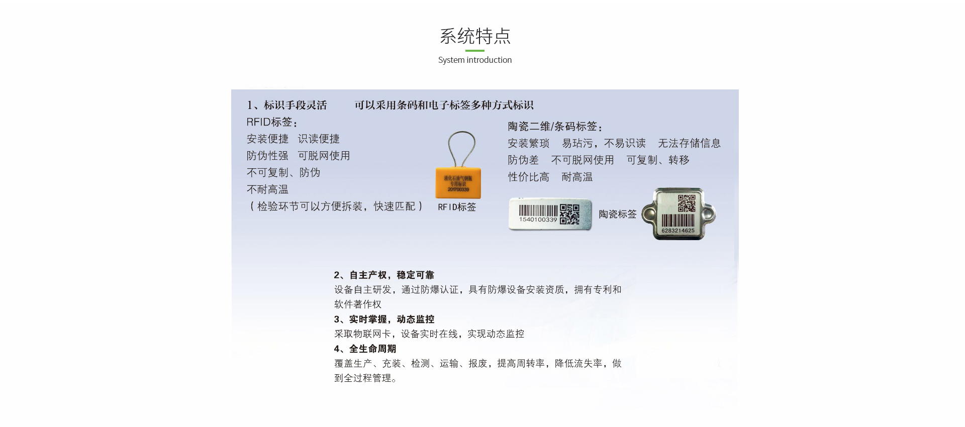 液化石油气瓶电子标签动态监管系统以采用先进的RFID技术实现气瓶的自动充装和追溯为基本目标,在气体公司所属的每个钢瓶.上通过专用的方式固定安装特殊形状频段的终身身份标识的电子标签本系统所涵盖的范围包括对气瓶的充装、检测、使用等过程加以控制,确保气瓶流转安全、消除事故隐患、维护企业职工的人身及财产安全,防止不法用户非法牟利。